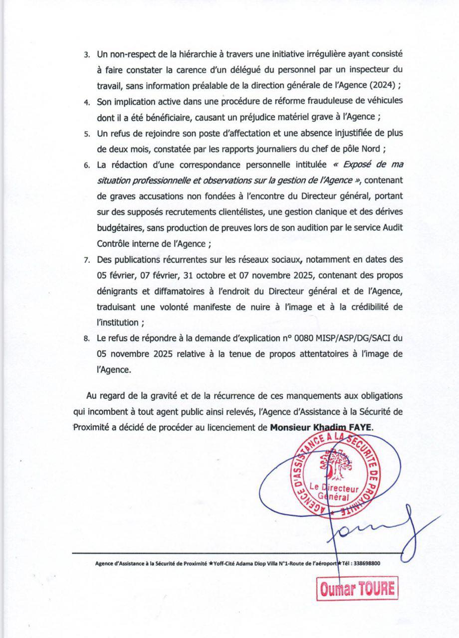 Par lettre n°418/MISP/ASP/DG/SG/DRH/CDGP du 10 novembre 2025, l’Agence d’Assistance à la Sécurité de Proximité (ASP) a notifié à Monsieur Khadim FAYE, successivement Comptable des matières, Chef de la Division logistique et Contrôleur territorial Nord, son licenciement pour fautes ayant gravement porté atteinte aux intérêts matériels, à l’image et à la réputation de l’Agence.